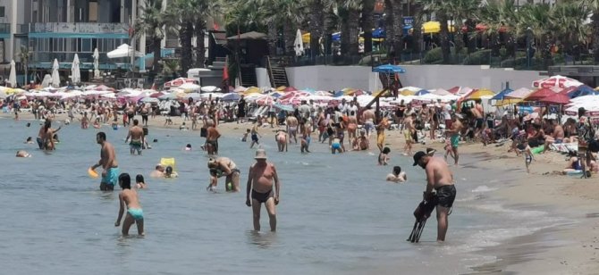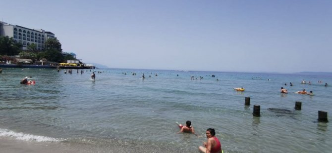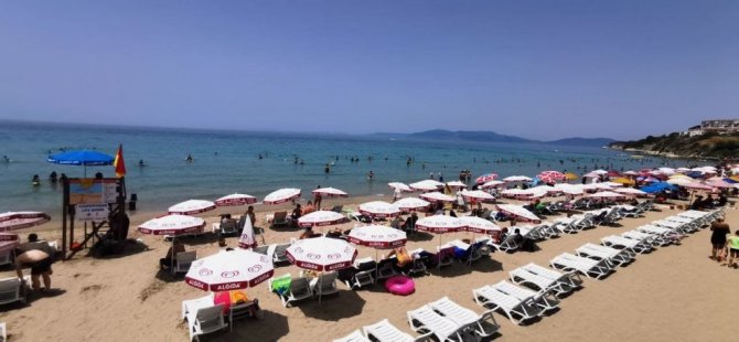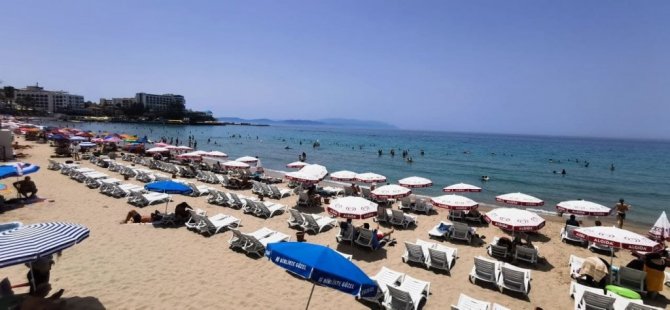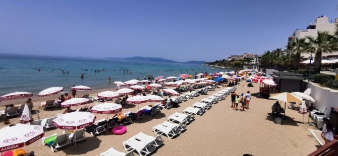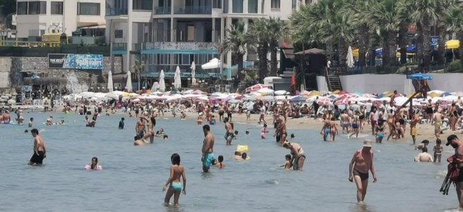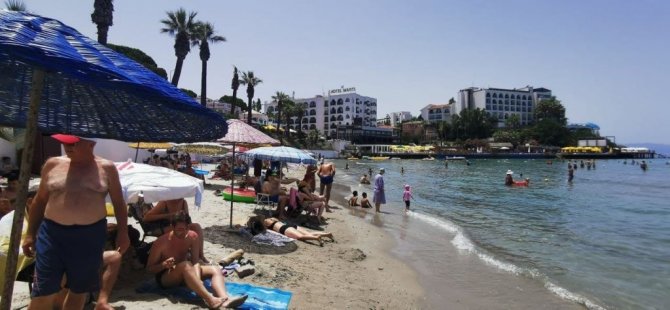 Aydın'ın Kuşadası ilçesinde etkili olan sıcak hava ile birlikte yerli ve yabancı turistler sahilleri doldurdu.