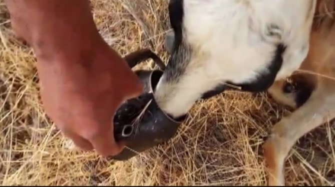 Malatya'nın Doğanşehir ilçesinde su içmek istediği kuyuya düşen koyunu, çoban Mustafa Karakaş'ın kurtardığı ve sıcak havanın etkisiyle baygınlık geçiren bir koyuna demlikle su içirdiği anlar cep telefonu kamerasıyla görüntülendi.