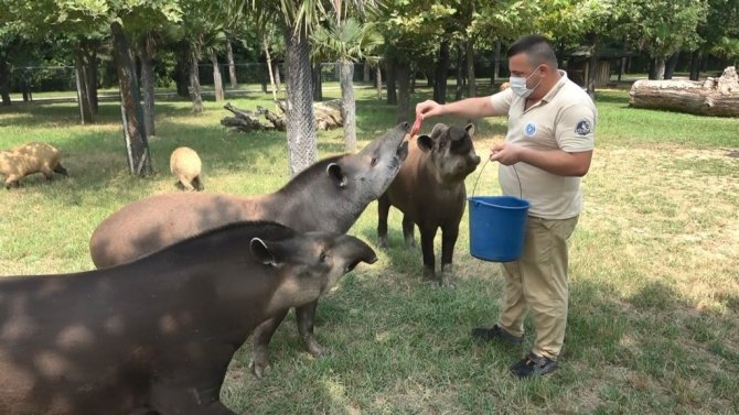 Hayvanat Bahçesi'nin Brezilyadan gelen sakinleri tapirler ise, bakıcılarının elinden karpuz keyfinin ardından masajları ile gülümsetti.