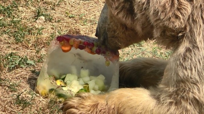 Hayvanat Bahçesi'ni ziyaret eden vatandaşlar, hayvanların buzlu meyve ile beslenme saatine denk geldikleri için kendilerini şanslı hissettiklerini söylerken, ayıların buzlu meyvelerden sonra suyun içinde kavun keyfi herkesi özendirdi.