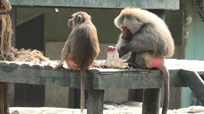 Zoopark görevlileri, özel olarak hazırladıkları buzlu meyveleri hayvanların yaşama alanına bırakarak serinlemelerini sağlıyor. Bakıcılarının bıraktıkları meyveleri yemek için bir biriyle yarışan maymunlar, renkli görüntüler oluşturdu.
