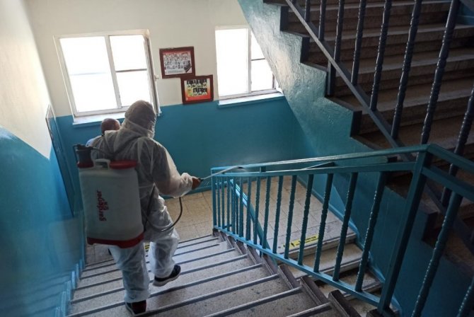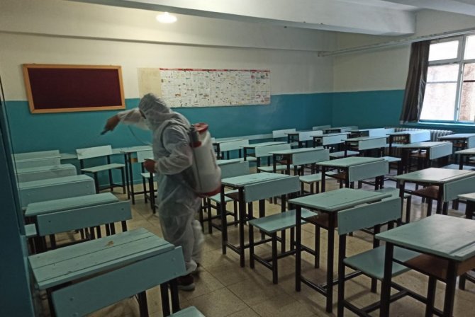 Dezenfekte çalışması gerçekleştiren ekipler, öğrencilerin toplu olarak kullandığı sınıflar, okul koridoru, yemekhane, konferans salonu, tuvaletler ve diğer kullanım alanlarını dezenfekte ediyor. Dezenfekte çalışmalarının aralıklarda devam edeceği öğrenildi.