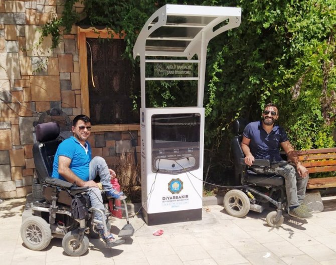 Diyarbakır Büyükşehir Belediyesi, Silvan İlçesi Hükümet Konağı Önündeki Parka akülü tekerlekli sandalyeler için şarj istasyonu kurdu.
