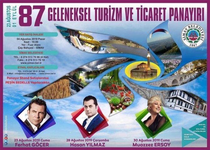 Kütahya’nın Simav ilçesinde geleneksel olarak her yıl düzenlenen turizm ve ticaret panayırının, 23 Ağustos-1 Eylül 2019 tarihleri arasında 87’inci kez yapılacağı bildirildi.