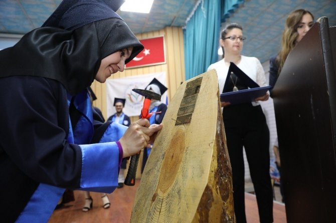 Yöresel oyunlar ve gösterilerin ardından, 32 mezun öğrencinin birincisi olan Tıbbi Laboratuvar Bölümü öğrencisi Merve Aytan tarafından mezuniyet kütüğüne isim çakma töreni yapıldı. Mezun olan öğrencilerin kep atması ve hatıra fotoğraflarının çekilmesiyle mezuniyet töreni sona erdi.