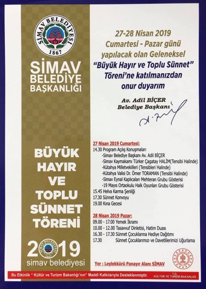 Kütahya’nın Simav ilçesinde, 50 yıllık bir geçmişi olan geleneksel toplu sünnet töreni ve büyük hayır hazırlıklarında sona gelindi. 27-28 Nisan 2019 tarihlerinde yapılması planlanan geleneksel etkinliğin, Simav Belediyesi koordinatörlüğünde, Simavlı hayırseverlerin yardımları ile Kültür ve Turizm Bakanlığı’nın katkılarıyla gerçekleştirileceği bildirildi.