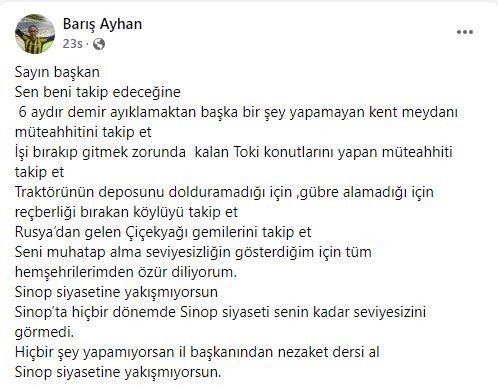 Bu paylaşıma sessiz kalmayan Belediye Başkanı Barış Ayhan ise ilçe başkanının paylaşımını alıntı yaparak, "Sayın Başkan, sen beni takip edeceğine 6 aydır demir ayıklamaktan başka bir şey yapamayan kent meydanı müteahhidini takip et, işi bırakıp gitmek zorunda kalan TOKİ konutlarını yapan müteahhidi takip et, traktörünün deposunu dolduramadığı için, gübre alamadığı için rençberliği bırakan köylüyü takip et, Rusya'dan gelen çiçek yağı gemilerini takip et. Sinop siyasetine yakışmıyorsun, Sinop'ta hiçbir dönemde Sinop siyaseti senin kadar seviyesizini görmedi. Hiçbir şey yapamıyorsan il başkanından nezaket dersi al, Sinop siyasetine yakışmıyorsun" şeklinde paylaşımda bulundu.