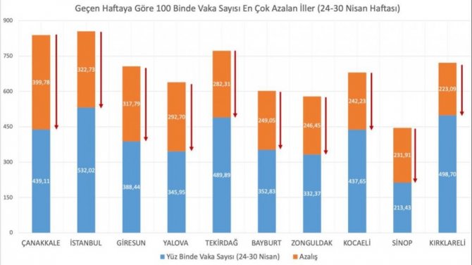 17-23 Nisan tablosunda kent ulaştığı en yüksek seviye olan yüz binde 445,35'i görmüştü. 24-30 Nisan tablosunda ise bir önceki haftaya göre yüzde 231,91 oranında düşüş yaşandı. Yüz binde 213,43 vaka oranıyla Sinop vaka sayılarının en çok azaldığı 9. il olduğu görüldü. Yaşanan azalma bu hafta da devam etti. 1-7 Mayıs tablosunda vaka oranı 167,34'e geriledi.
