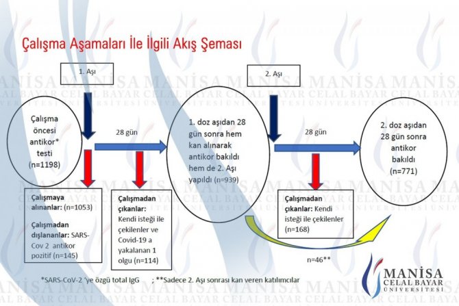 Manisa CBÜ hastanesi gönüllü sağlık çalışanları üzerinde yürütülen, Manisa CBÜ Tıp Fakültesi Etik Kurulu tarafından onaylanan bir aşı antikor yanıtı çalışması olan araştırmanın verileri 11 Ocak - 18 Mart 2021 tarihleri arasında toplandı ve aşılama öncesi tüm katılımcılara antikor testi yapılarak, SARS- CoV-2 antikoru saptanmayan 1053 kişi çalışmaya alınmadı. Yapılan araştırmada tüm sağlık çalışanlarının birinci aşıdan en az 28 gün sonra (939 katılımcıdan) ve ikinci aşıdan en az 28 gün sonra (771 katılımcıdan) elde edilen özet sonuçlar ise şu şekilde açıklandı: "Genel bulgular: 1. aşıdan en az 28 gün sonra bağışıklık yüzdesi yüzde 25.3 (Yüzde 95 GA: 22.5 - 28.1), 2. aşıdan en az 28 gün sonra Nötralizan (Kantitatif) testi bağışıklığı yüzde 97.92 (Yüzde 95 GA: 96.91 - 98.93) 2. aşıdan en az 28 gün sonra Nötralizan (Kalitatif) testi bağışıklığı yüzde 97.79 (yüzde 95 GA: 96.75 - 98.23) olarak belirlendi."