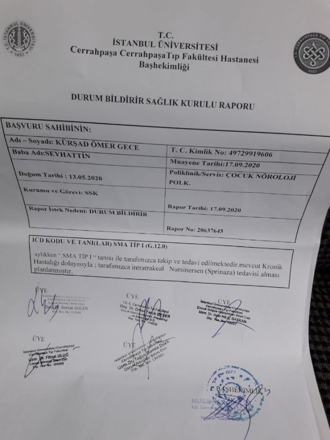 Amasya'nın Suluova ilçesinde ikamet eden ve çocuklarının tedavisi için uzun süredir İstanbul'da olan Nesibe ve Seyhattin Gece (45) çiftinin 7 ay önce dünyaya gelen çocukları Kürşat Ömer, 3 aylıkken hareketlerindeki yavaşlığı nedeniyle ailesi tarafından hastaneye götürüldü. Yapılan genetik test sonucu Kürşat Ömer'e SMA tip 1 teşhisi konuldu. Yaşıtları gibi nefes alamayan, hareket edemeyen Kürşat Ömer'in sağlığına tam anlamıyla kavuşabilmesi için gen tedavisi olması gerektiği belirtildi. ABD'de 2 yaş altı SMA hastalarına uygulanan gen tedavisi için ailesi yardım kampanyası başlattı. Minik Kürşat'ın sağlığına kavuşabilmesi için 2,2 milyon euroya ihtiyacı var. Aile ise hayırseverlerden yardım bekliyor.