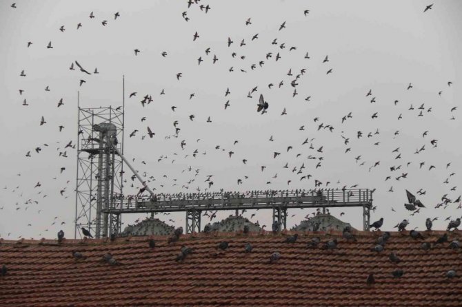Eskişehir'de soğuk hava nedeniyle yiyecek bulmakta zorlanan güvercinler, Ticaret Borsası'na ait bina çatıları ve siloların üzerinde kalan buğday tanelerine hücum etti.