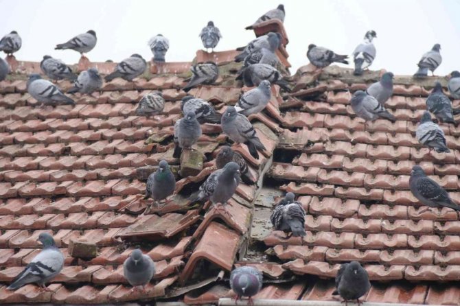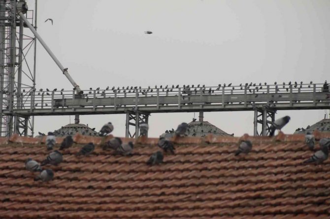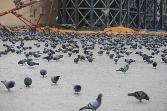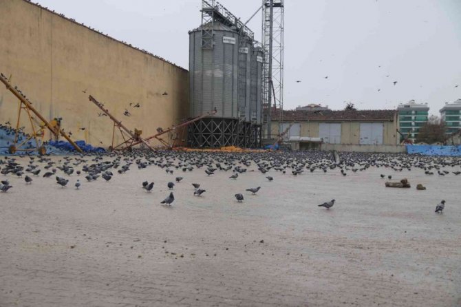 Soğuk havada yiyecek bulamayan yüzlerce güvercin silolara hücum etti
