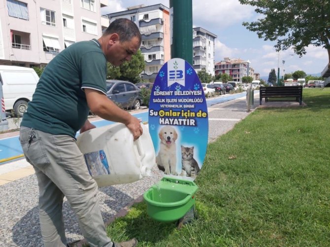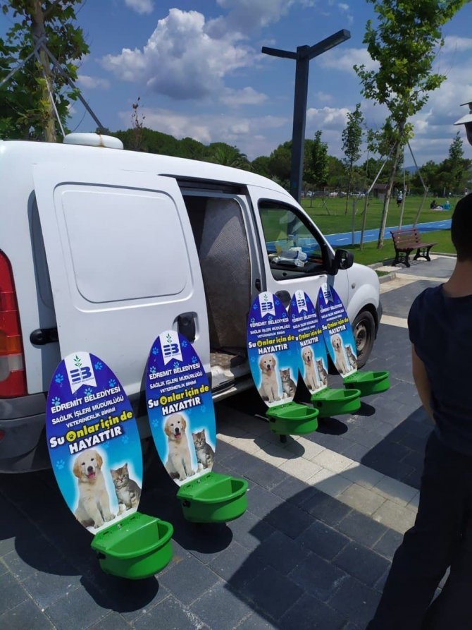 Edremit Belediyesi Sağlık İşleri Müdürlüğü, hava sıcaklığının arttığı yaz aylarında sokak hayvanlarının mama ihtiyacının giderilmesinin yanı sıra susuzluk sorununa da çözüm üretiyor.
