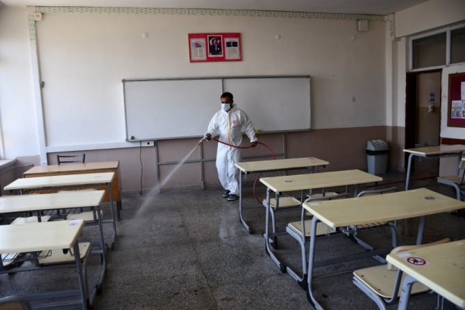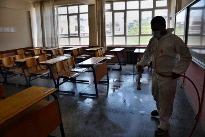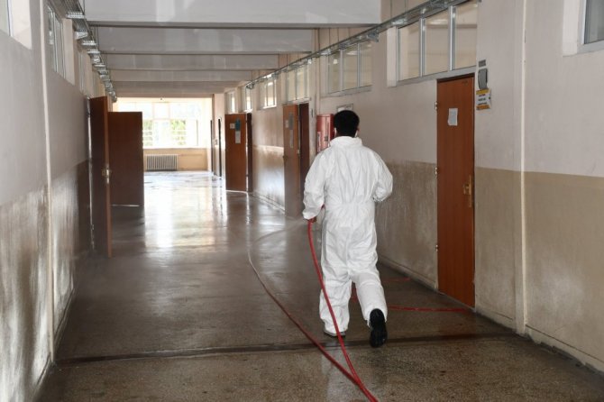 Kovid-19 (korona virüs) ile mücadele tedbirleri kapsamında gerçekleştirilen çalışmalarda 26-27 Haziran tarihlerinde Cumartesi ve Pazar günü sınavların gerçekleştirileceği tüm okullarda sınıflar ilaçlanarak dezenfekte ediliyor. Sadece sınıflar değil okul koridorları, merdiven korkulukları gibi temas edilebilecek tüm noktalarda dezenfekte çalışması yapıldı.