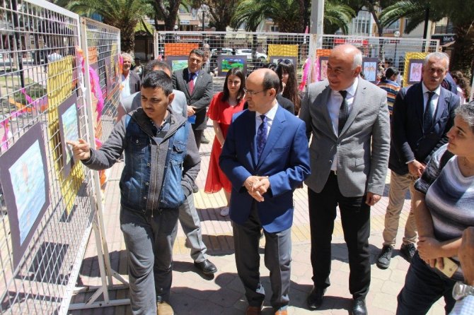 Kullandığı renkler ve figürleri ile beğeni toplayan Sökeli Andaç Barış Yılmaz’ın eserlerinin yer aldığı sergi Belediye meydanında açıldı.