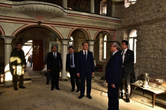Manisa Valisi Ahmet Deniz, İzmir Vakıflar Bölge Müdürlüğü tarafından restorasyonu devam eden Damgacı (Hacı Musa) Camisi, Emir Hıdır Bey Camisi ile tarihi bedesten ve hamam yapılarında incelemelerde bulunarak yetkililerden bilgi aldı.
