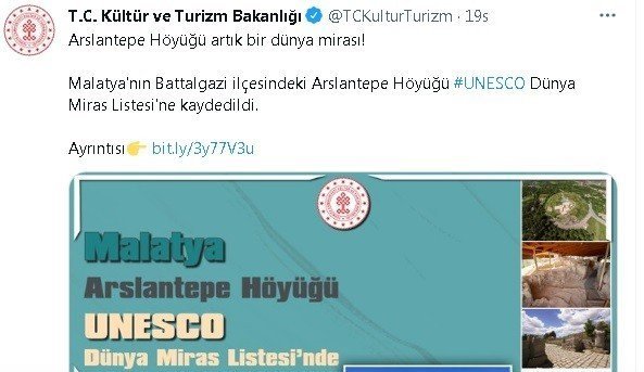 Kültür ve Turizm Bakanlığı sosyal medyasında ise "Arslantepe Höyüğü artık bir dünya mirası! Malatya'nın Battalgazi ilçesindeki Arslantepe Höyüğü UNESCO Dünya Miras Listesi'ne kaydedildi" denildi.
