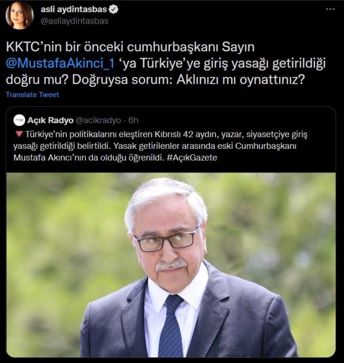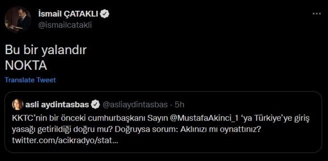 Avrupa Dış İlişkiler Konseyi Üyesi Aslı Aydıntaşbaş, serbest çalışan bir haber sayfasının, "Türkiye'nin politikalarını eleştiren Kıbrıslı 42 aydın, yazar ve siyasetçiye giriş yasağı getirildi. Yasak getirilenler arasında eski Cumhurbaşkanı Mustafa Akıncı'nın da olduğu öğrenildi" paylaşımını alıntılayarak, "Kuzey Kıbrıs Türk Cumhuriyeti'nin (KKTC) bir önceki Cumhurbaşkanı Mustafa Akıncı'ya giriş yasağı getirildiği doğru mu? Doğruysa sorum: Aklınızı mı oynattınız?" ifadelerine yer verdiği bir paylaşım daha yaptı. Bunun üzerine İçişleri Bakanlığı Sözcüsü İsmail Çataklı ise, söz konusu paylaşımı alıntılayarak, "Bu bir yalandır. Nokta" dedi.