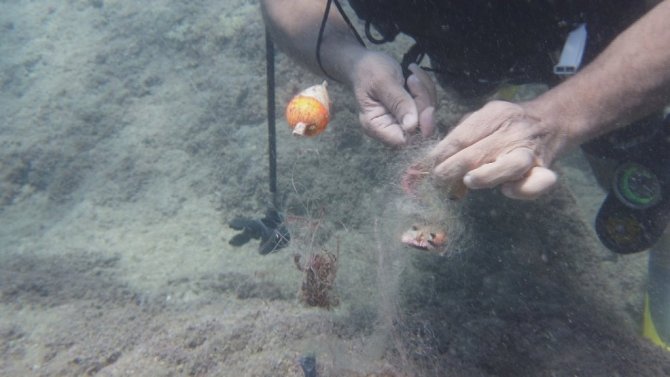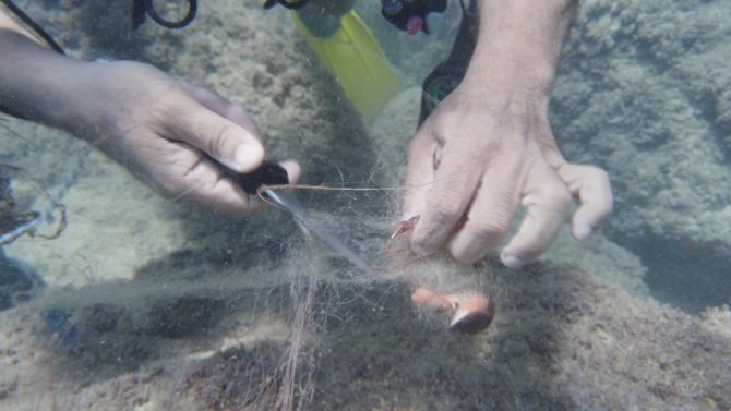 Falezler altındaki dalışlarda karşılaştıkları en büyük sorunlardan birinin hayalet ağlar olduğunun altını çizen Mehmet Gökoğlu, "Halk arasında bu ağlar tırı vırı olarak adlandırılır. Esasında bu ağın satılması ve kullanılması yasak. Bu ağ su altında kaldığı sürece balıklar bu ağlara takılıyor ve orada kalıyor. Bir süre sonra ise ölüyorlar" dedi.