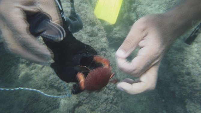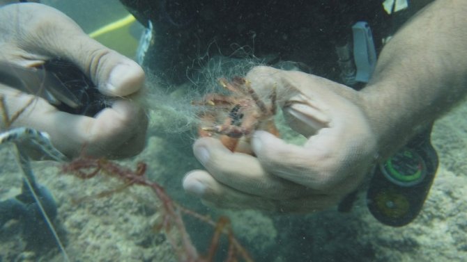 Su altındaki bir ağa iki tane gül yengecinin dolandığını gördüklerini anlatan Gökoğlu, "Gül kırmızısı rengi olan bir canlıdır. Ağa dolanmışlar. Yengeçleri kurtardık ve doğal ortamına bıraktık. Kıl gibi bir ağ, yengeçlerin ayakların dolanmış uzun uğraş sonucu kurtardık. Yengeçlerden birinin ayakları kopmuştu, onu da karada kurtardık. Bu tür av araçlarının kullanılması yasak. Bu ağ su altında kaldığı sürece başka canlıları yakalamaya devam edecek. Katil ağların satışlarının yasaklanması gerekir" diye konuştu.