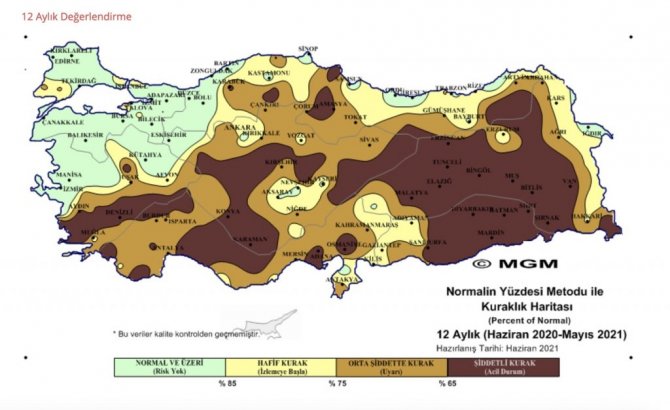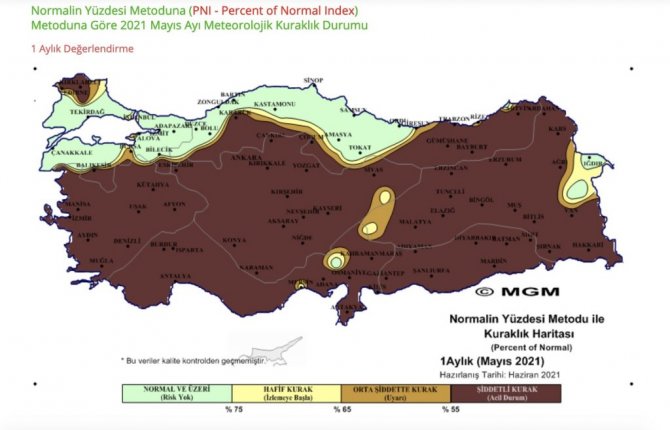 Meteorolojinin paylaştığı Standart Yağış İndeksi (SPI) ve Normalin Yüzdesi Metodu'na (PNI) göre, hazırlanan Mayıs 2021 ile son iki yıllık meteorolojik kuraklık haritalarında, Türkiye'nin büyük bir bölümü "olağanüstü kurak', "çok şiddetli kurak', "şiddetli kurak" olarak gösterildi. 2021 yılı Mayıs Ayı Ortalama Sıcaklıkları Raporuna göre, son 50 yılın en sıcak mayıs ayı yaşandı.