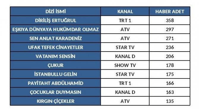 Medya takibinin önemli kurumu Ajans Press, Şubat ayının televizyon raporunu çıkardı. Ajans Press’in gerçekleştirdiği medya incelemesine göre, özellikle son zamanlarda ekranlara gelen tarihi ve askeri dizilerin popülaritesinin artmaya başladığı belirlenirken geçtiğimiz ayın en çok konuşulan dizisi 358 habere konu olan Diriliş Ertuğrul oldu. Diriliş Ertuğrul’u 297 habere konu olan Eşkıya Dünyaya Hükümdar Olmaz takip ederken ilk bölümünden itibaren izleyiciyi ekran başına kilitleyen Sen Anlat Karadeniz dizisi 271 haberle listenin üçüncü sırasında yer aldı. Ufak Tefek Cinayetler 236 haberle dördüncü sırada yer alırken, Vatanım Sensin 206 haberle beşinci, Çukur 178 haberle altıncı, İstanbullu Gelin 175 haberle yedinci, Payitaht Abdülhamid 166 haberle sekizinci, Çocuklar Duymasın 163 haberle dokuzuncu Kırgın Çiçekler 135 haberle onuncu sırada yer aldı.