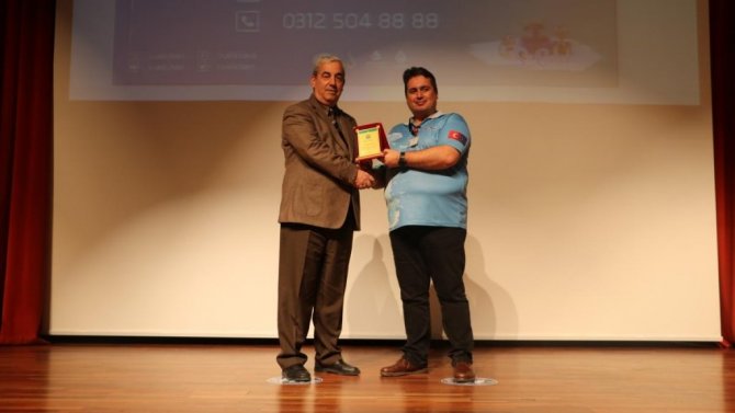 Etkinlik sonunda İnönü Üniversitesi Rektör Danışmanı ve Yeşil Kampüs Koordinatörü Dr. Öğr. Üyesi Cemal Koyunoğlu tarafından Özgür Aydıncak'a katılımlarından dolayı plaket takdim edildi.