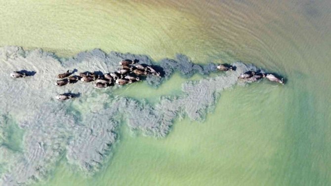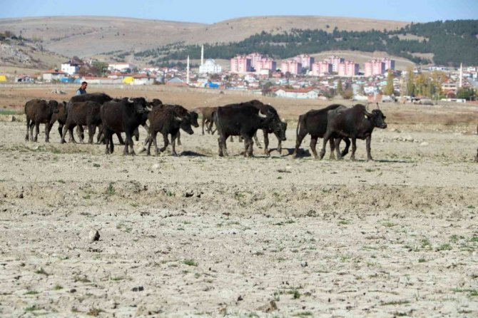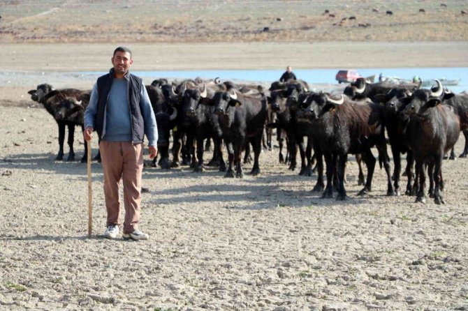 Yozgat'ın Çekerek ilçesine bağlı İshaklı köyünde manda yetiştiriciliğiyle uğraşan 28 yaşındaki Kenan Yalnız, kuraklık nedeniyle suları çekilen Çekerek Barajında hem hayvanlarını suya sokmak hem de yeşeren baraj zemininde hayvanlarını otlatmak için her gün 4 kilometre yol kat ediyor.