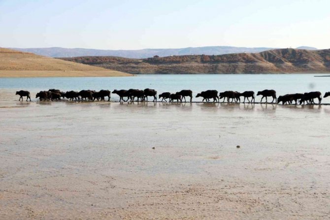 Suları çekilen baraj zemininde hayvanlarını otlatmak için 4 kilometre yol kat ediyor