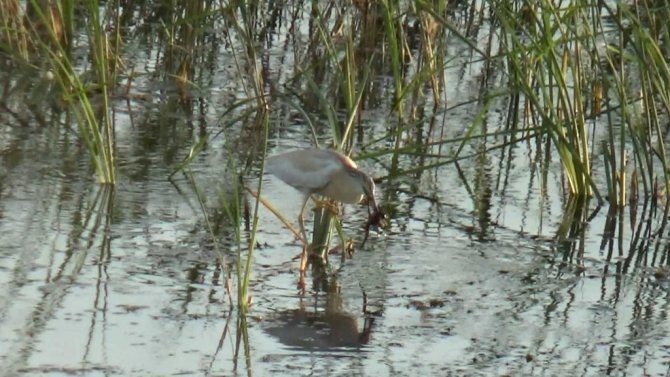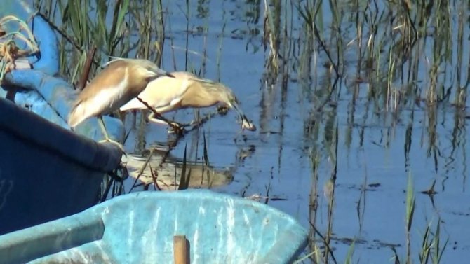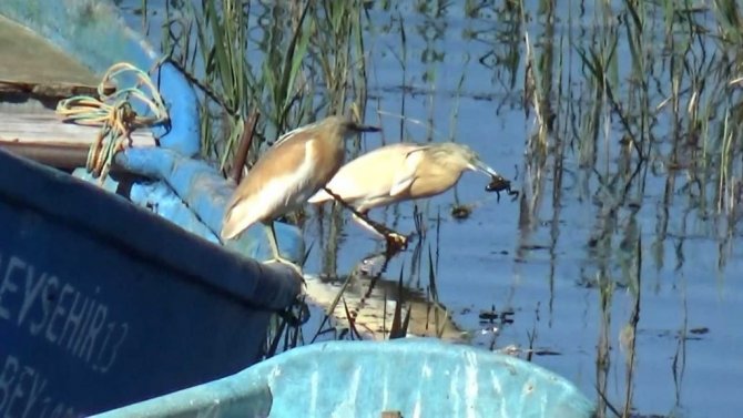 İçerişehir Mahallesi kıyısında, tekne üzerinde avı için suları gözleyen bir balıkçıl kuşunun aniden kalkış yaparak sazlar arasında suya dalış yapıp yakaladığı kurbağayı tekrar beklediği teknenin yanına getirip konduğu halat üzerinde yediği anlar da kameralara yansıdı. Göl kıyılarındaki teknelerin üzerinde ve otlarla kaplı su yüzeyinde bekleyerek sığ sularda av için dakikalarca bekleyen balıkçıl kuşları, gün boyu küçük balıklarla besleniyor.