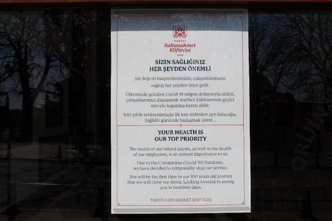 İstanbul’da Tarihi Yarımada’da 1 asırdır yerli, yabancı binlerce kişinin yemek molası verdiği 104 yıllık Tarihi Sultanahmet Köftecisi, korona virüs (Covid-19) salgını nedeniyle geçici olarak dükkânını kapattı. Kapıda yazılan notta, “100 yıllık serüvenimizde ilk kez sizlerden ayrı kalacağız” ifadeleri kullanıldı. Öte yandan havadan çekilen görüntülerde de tarihi Sultanahmet Meydanı’nın neredeyse boş olduğu gözüktü.