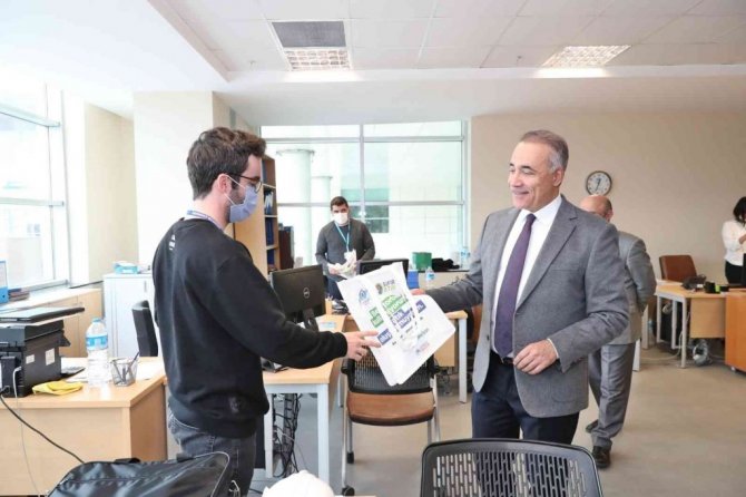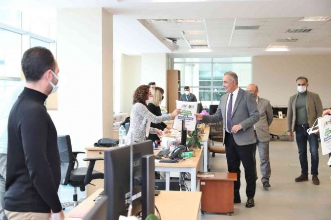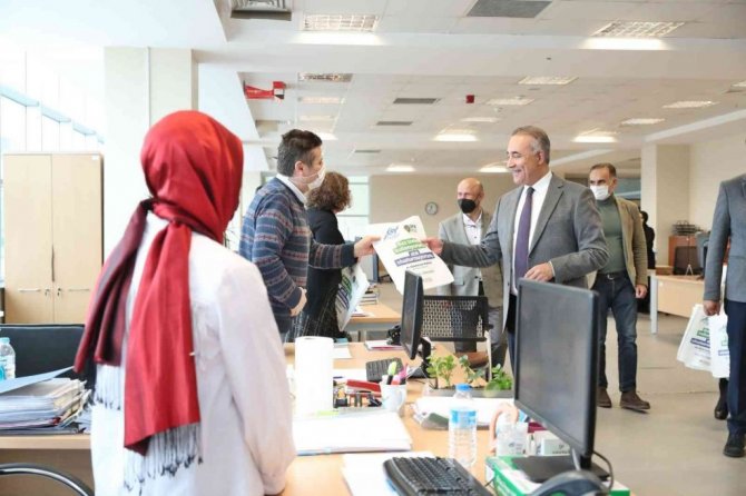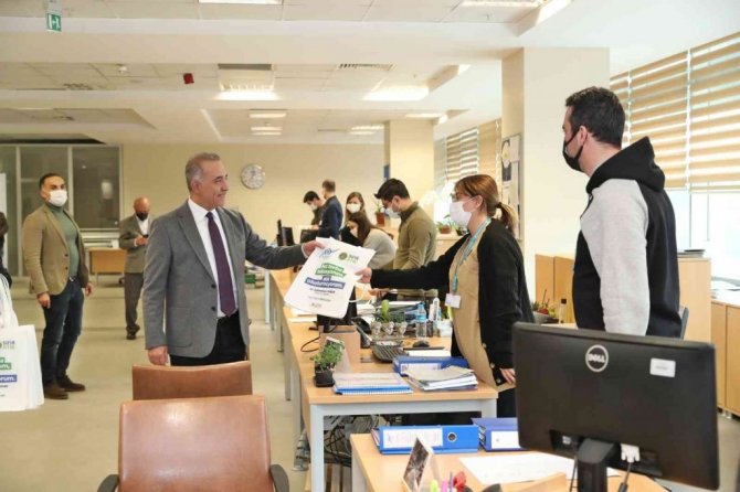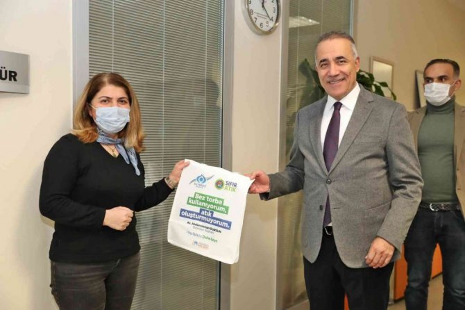 Başkan Dursun, daha sonra belediye hizmet binasında diğer birimleri de ziyaret ederek personele bez torba dağıtımı gerçekleştirdi.
