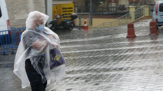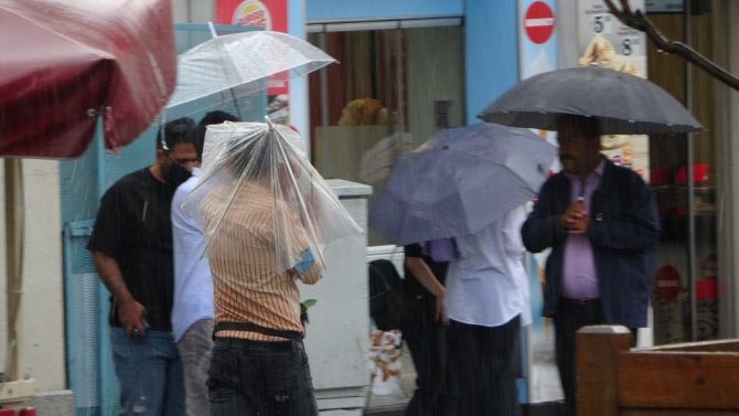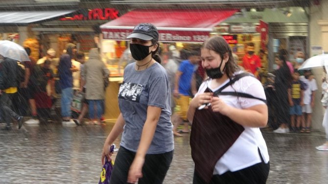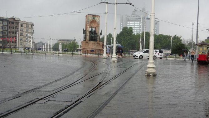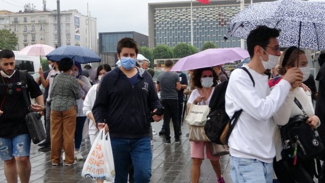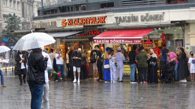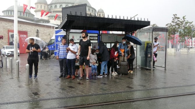Taksim'de aniden bastıran sağanak yağışa yakalanan vatandaşlar zor anlar yaşadı. Yağmurun bastırmasıyla birlikte vatandaşlar şemsiyelerine sarıldı. Şemsiyesi olmayan vatandaşlar ise duraklara ve dükkan tentelerinin altlarına sığınarak yağmurun dinmesini bekledi.