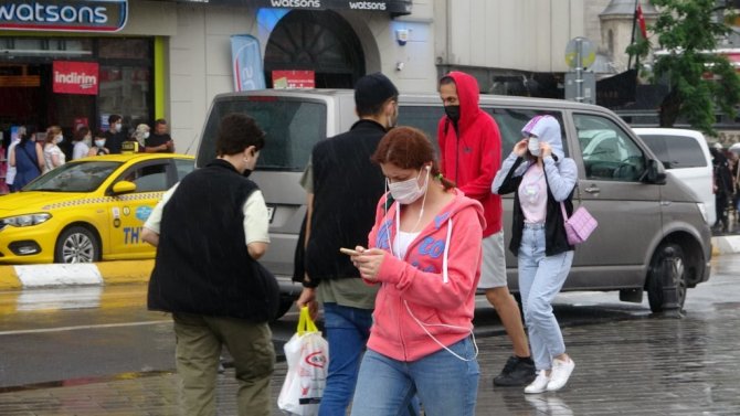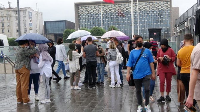 Taksim" de aniden bastıran sağanak yağış vatandaşlara zor anlar yaşattı. Şemsiyesi olmayan vatandaşlar durak ve tentelerin altına girerek yağmurdan korunmaya çalıştı.