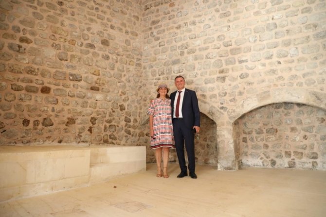 Amaçlarının özel sektörle rekabet etmek olmadığını belirten Başkan Savaş, "Hatay'daki bu tarihi dokular içerisinde restore edilip, fonksiyon verilebilir mekanlar olduğunu göstermek ve özel müteşebbise örnek olmak, aynı diğer yerlerde yaptığımız gibi. 10 odalı konuk evinde gelen misafirlerimiz kalacaklar. Tarihi bir alan ve bahçe içerisinde sabah kahvaltılarını da yapacaklar. Öğle ve akşam yemeklerini de ya bizim gastronomi evimizde ya da özel müteşebbisin olduğu yerde yemeklerini yiyebilirler. Biz bu bahçeye avlu diyoruz ama Antakya'da hayat derlerdi. Hayatın bahçe de olduğu yer anlamında derlerdi. İnsanların bahçe de oturdukları zaman hayat bulacakları bu mekanda ağaçların altında oturmanın zevkini tadacaklar hem de tarihi bir mekanın içerisinde dinlemenin zevkini tadacaklar. Eylül ayına kadar bitirmeyi temenni ediyoruz. EXPO'dan önce açıp önemli misafirlerimizi burada ağırlamak istiyoruz" diye konuştu.