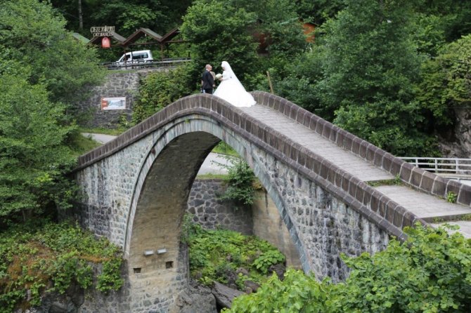 Artvin'in Arhavi ilçesinde bulunan kesme taş mimarisiyle yıllara meydan okuyan tarihi Çifte Köprüler, bugünlerde düğün fotoğrafı çektiren çiftler nedeniyle yoğun ilgi görüyor.