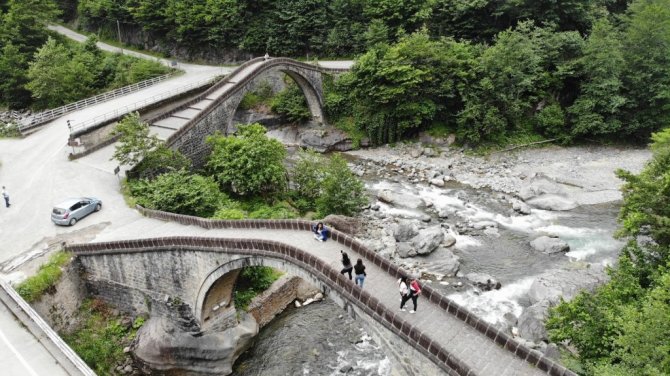 Artvin'in Arhavi ilçesinde bulunan kesme taş mimarisiyle yıllara meydan okuyan tarihi Çifte Köprüler, bugünlerde düğün fotoğrafı çektiren çiftler nedeniyle...