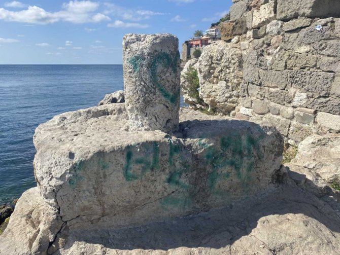 Bartın'ın Amasra ilçesinde Cenevizliler döneminde inşa edildiği bilinen ve Kraliçe Amastris'in havuzunun olduğuna inanılan Direkli Kaya'ya kimliği belirsiz kişi ya da kişilerce sprey boyalarla yazılar yazıldı.