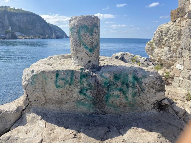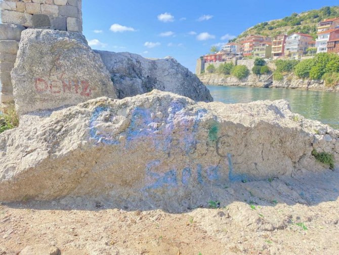 Bartın'ın Amasra ilçesinde Cenevizliler döneminde inşa edildiği bilinen ve Amasra'ya ismini veren Kraliçe Amastris'in havuzunun olduğuna inanılan Direkli Kaya'ya kimliği belirsiz kişi ya da kişilerce sprey boyalarla isim ve çeşitli yazılar yazıldı.