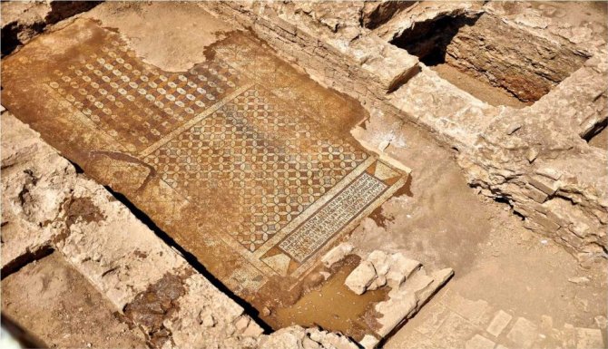"Mozaiğin ilgi çeken yanı, üst kısmında dikdörtgen pano üzerinde siyah tesseralardan oluşturulmuş 5 satırlık eski Yunanca yazıttır. Mozaik üzerindeki yazıt üzerinde, "Eşin Hedia ve çocuklarınla burada sağlıklı banyo yap. Ey Iphikrates! Düşmanlarına karşı müşfik dostlarına karşı kararlı ol. Tek başına olsan bile kendini büyük bir kalabalık gibi sunarak en güzel şekilde yaşa. Benim için ne istiyorsan Tanrı sana iki katını versin" yazmaktadır."