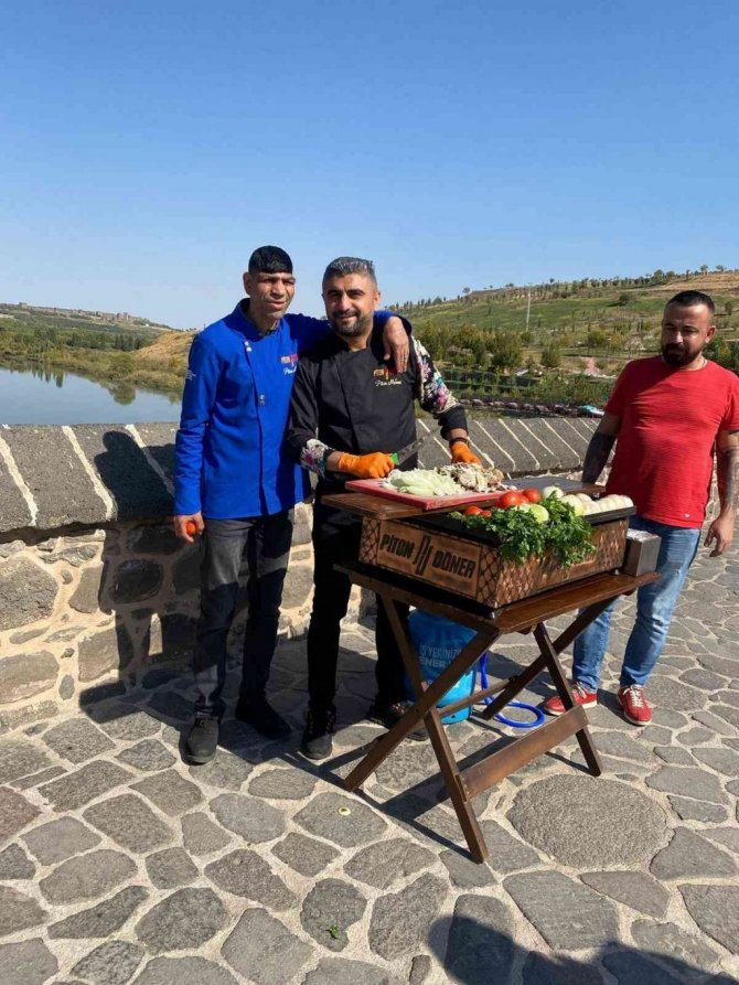 Burada tarihi Dicle Köprüsü'nün üzerinde Diyarbakırlı sosyal medya fenomeni Hikmet Ulucan ile birlikte "piton döner" yapan Taş, daha sonra yaptığı döneri vatandaşlara dağıttı.