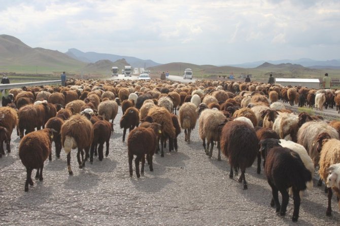 İlkbahar mevsimiyle birlikte zorlu yayla yolculuğuna başlayan Iğdırlı besiciler, tarım arazilerine zarar vermemek için koyun sürüsünü asfalt yollardan geçirerek yaylalara ulaştırmaya çalışıyor.