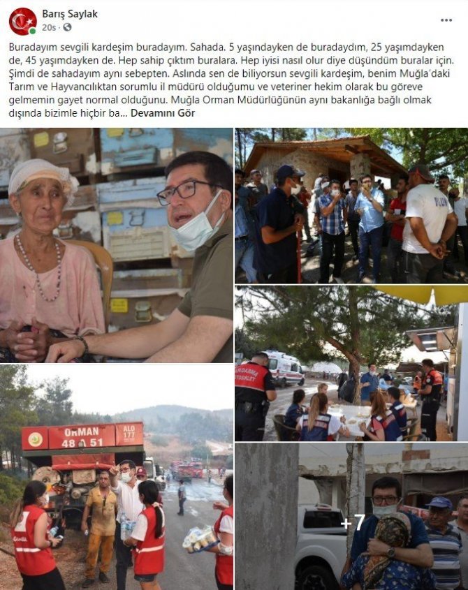 Bu paylaşımlarla ilgili olarak İl Müdürü Barış Saylak tarafından sosyal medyadan açıklama yapıldı. Açıklamasının hemen hemen her satırında Muğla'ya olan sevdası ve görev aşkından bahseden Saylak'ın mesajında şu ifadeler yer aldı: "Buradayım sevgili kardeşim buradayım. Sahada. 5 yaşındayken de buradaydım, 25 yaşımdayken de, 45 yaşımdayken de. Hep sahip çıktım buralara. Hep iyisi nasıl olur diye düşündüm buralar için. Şimdi de sahadayım aynı sebepten. Aslında sen de biliyorsun sevgili kardeşim, benim Muğla'daki Tarım ve Hayvancılıktan sorumlu il müdürü olduğumu ve veteriner hekim olarak bu göreve gelmemin gayet normal olduğunu. Muğla Orman Müdürlüğü'nün aynı bakanlığa bağlı olmak dışında bizimle hiçbir bağı yok. Yani benim İl Tarım ve Orman Müdürü olarak Muğla'daki orman alanları ve yangınları yönetmekle ya da müdahale etmekle ilgili hiç bir tasarrufum ve yetkim olamaz. Ki zaten uzmanlığım değil. Ve uzmanlığım olmayan konularda fikir beyan etmek tarzım değil. Ama bu noktada Milas'ın bir köyünde bu topraklara, bu ormana doğmuş biri olarak, o ormanın dibindeki denizde yüzmeyi öğrenen çocukluğumu nasıl unuturum? Tabi ki ben ve ekibimin tamamı sorumluluk alanımız olmasa da, yangın sahasında tüm gücüyle çalışan Orman Genel Müdürlüğümü'zün yanında olduk. İl müdürü olarak değil, Muğla'nın evladı olarak. Sevgili kardeşim ben memleketim yanarken siyaset yapmayacağım. Şu an yemek molası verdik. Az sonra yangın bölgesinde kalan hayvanları güvenli alanlara taşımaya ve tarım arazisi yanan üreticimizin hasar tespit çalışmalarını yapmaya devam edeceğiz. Eğer yerimde olsanız siz de bu durumda o insanların gözlerine bakıp siyaset yapmazdınız. Eksiklerimiz var mıdır. Vardır elbet. Ama bu çabamızı azaltmaz. Bir tane Muğla var sevgili kardeşim ve benim gidecek başka evim yok. Şimdi sahaya dönmem lazım. Evim çok sıcak ama sizin klavyeniz buz gibi. Umarım kalbin de öyle değildir. Ben senin için üzüldüm sen de bizim için üzül olur mu?" ifadelerini kullandı.
