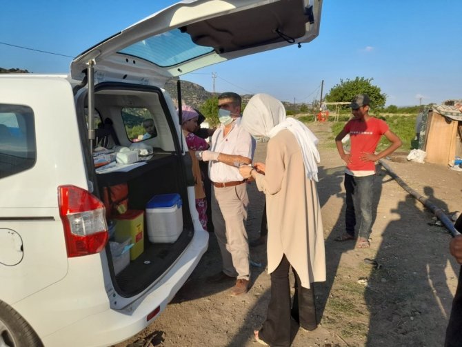 Manisa'nın Kula ilçesinde aşılama çalışmaları tüm hızıyla sürerken, mobil aşı ekipleri mevsimlik tarım işçilerine arazide aşılama çalışması yapmaya devam ediyor.