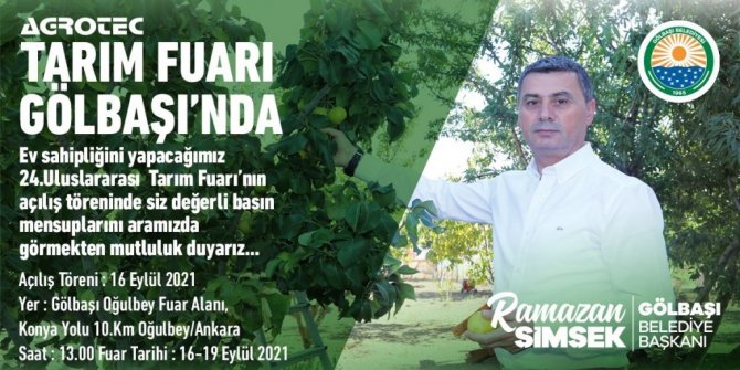 Tarım Sektörü 16-19 Eylül'de AGROTEC 2021 24. Uluslararası Tarım Fuarı'nda buluşacak. Tarım fuarına ev sahipliği yapacak olan Gölbaşı Belediye Başkanı Ramazan Şimşek, "Fuar vesilesiyle 60 bin kişinin Gölbaşı'na gelmesini hedefliyoruz" dedi.