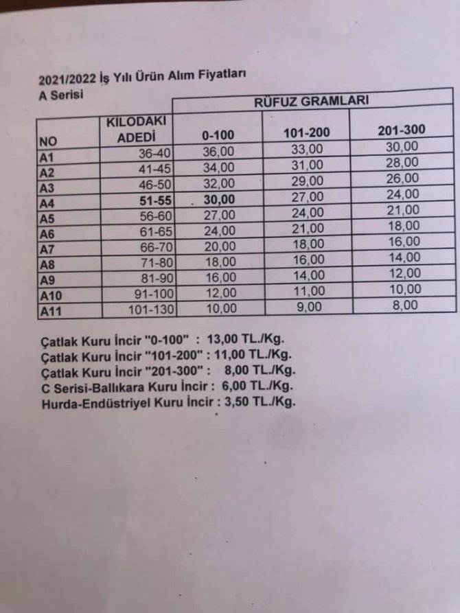 Aydın'ın altın sarısı kuru incirlerinde yeni sezon heyecanı devam ederken, TARİŞ İncir Birliği bu yılki alım fiyatlarını açıkladı. Her yıl olduğu gibi bu yıl da üreticilerin merakla beklediği alım fiyatlarını yapılan toplantının ardından açıklayan TARİŞ İncir Birliği Yönetim Kurulu Başkanı Mustafa Bircan, yeni sezonun üreticilere hayırlı olmasını diledi. Yapılan toplantının ardından 0-100 rüfuz incirin kilogramdaki adedi 36-40 arası olan A1 kalitesi için 36 TL, 41-45 arası olan A2 kalitesi için 34 TL, 46-50 arası olan A3 kalitesi için 32 TL, 51-55 arası olan A4 kalitesi için 30 TL, 56-60 arası olan A5 kalitesi için 27 TL, 61-65 arası olan A6 kalitesi için 24 TL, 66-70 arası olan A7 kalitesi için 20 TL, 71-80 arası olan A8 kalitesi için 18 TL, 81-90 arası olan A9 kalitesi için 16 TL, 91-100 arası olan A10 kalitesi için 12 TL ve 101-130 arası olan A11 kalitesi için de 10 TL fiyat tespit edildi.