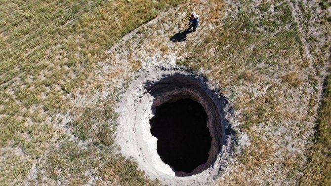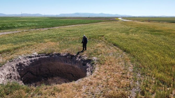 Sivrihisar ilçesine bağlı Yeniköy mahallesi Kaldırım Merası mevkiinde oluşan dev çukur, mahallede yaşayan köylüleri tedirgin ediyor. Geçtiğimiz yıllarda çevrede bulunan diğer tarım arazilerinde de görülmeye başlayan dev obrukların sayısı her geçen gün artıyor. Duyarsız vatandaşlar tarafından açılan su kuyuları ve yanlış su tüketimi sonucunda oluştuğu iddia edilen dev çukurlar mahallelileri endişelendiriyor. Göçüklerin oluşması sonucunda tarım arazileri büyük zarar görüyor. Yeniköy mahallesinde meydana gelen ve 30 metre derinlik ile 25 metre çapına sahip olan obruk, drone ile havadan görüntülendi. Hayvanlarını otlatmak için tarlaları kullanmak zorunda kalan veya tarım arazilerinde çalışan köylüler, çevrede çocukların da gezmesine dikkat çekerek, güvenliğin sağlanması konusunda yetkililerden yardım bekliyor.