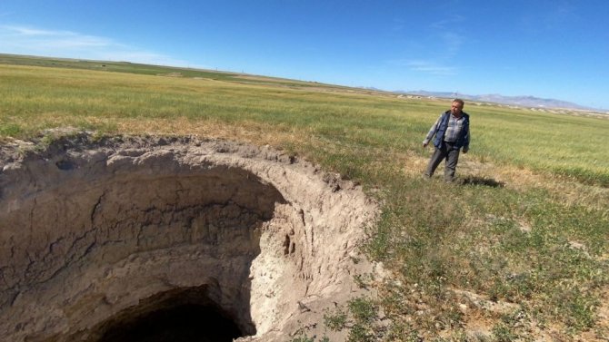 Tarla ortasında oluşan dev obruk köylüleri tedirgin ediyor