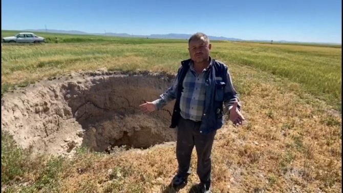 Eskişehir'in Sivrihisar ilçesine bağlı Yeniköy mahallesinde bulunan tarlada oluşan dev obruk, mahallede yaşayan vatandaşları endişelendiriyor.
