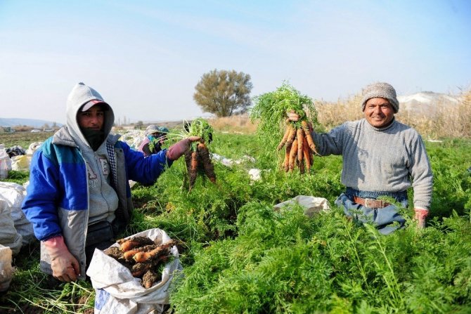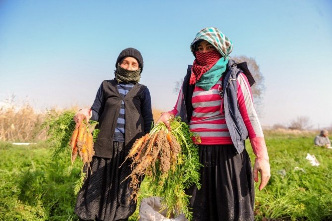 Havuç üreticisi Erhan Kızılay, 1 yıl boyunca aralıksız havuç üretiminin olduğunu belirterek kış havuç hasadının güzel başladığını söyledi. Havaların mevsim normallerinin üzerinde gitmesi, yağış olmaması gibi durumların havuç üretimini etkilemediğini vurgulayan Kızılay, en zor dönemlerin toprak üzerinin buz tuttuğu dönemler olduğunu aktardı. Tarlada çalışan işçilerin tamamının Suriyeli vatandaşlardan oluştuğunu belirten Kızılay, “Hasadımız güzel başladı. Bir sıkıntımız yok. Şartlar yoğunlaşacak ama bizim de buna karşı tedbirimiz var. Havaların sıcak gitmesi bizi şu anda etkilemiyor. Kış hasadında dönüm üzerinden ortalama 6-7 tonluk bir verim bekliyoruz. Şu anda bizimle birlikte 30 işçi çalışıyor ve çoğu Suriyeli. Suriye’den geldiler, burada çalışıyor. Kış hasadı olduğu için yağmur, çamur oluyor. İşçiler soğuk havalarda çalışmak istemiyor, günler kısa sürüyor, pazarda da belli başlı sıkıntılar yaşıyoruz. Bizim 365 gün havucumuz var. Havuç kış ürünü. Biz Şubat, Mart ayına kadar hasadımızı yapıyoruz. Bu aylardan sonra depoda kalan havuçlarımızı sunuyoruz. Haziran ayında taze ürünümüz çıkıyor ve böylece devam ediyoruz” dedi.